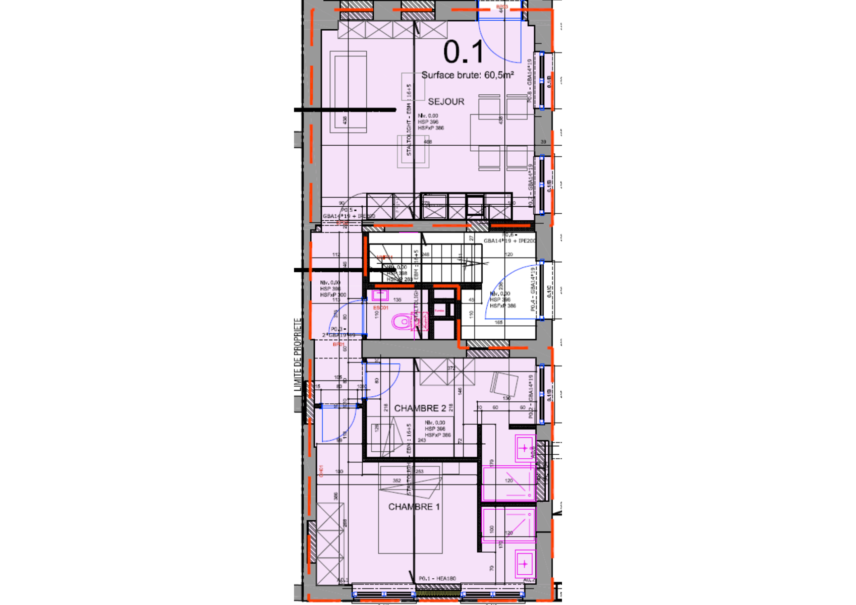 Appartement 0.1 – Rez-de-chaussée – 60 m² : Séjour de 21m², une chambre de 8 m² et la seconde de 12 m², salle de douche dans chaque chambre, WC séparé, cave privative.