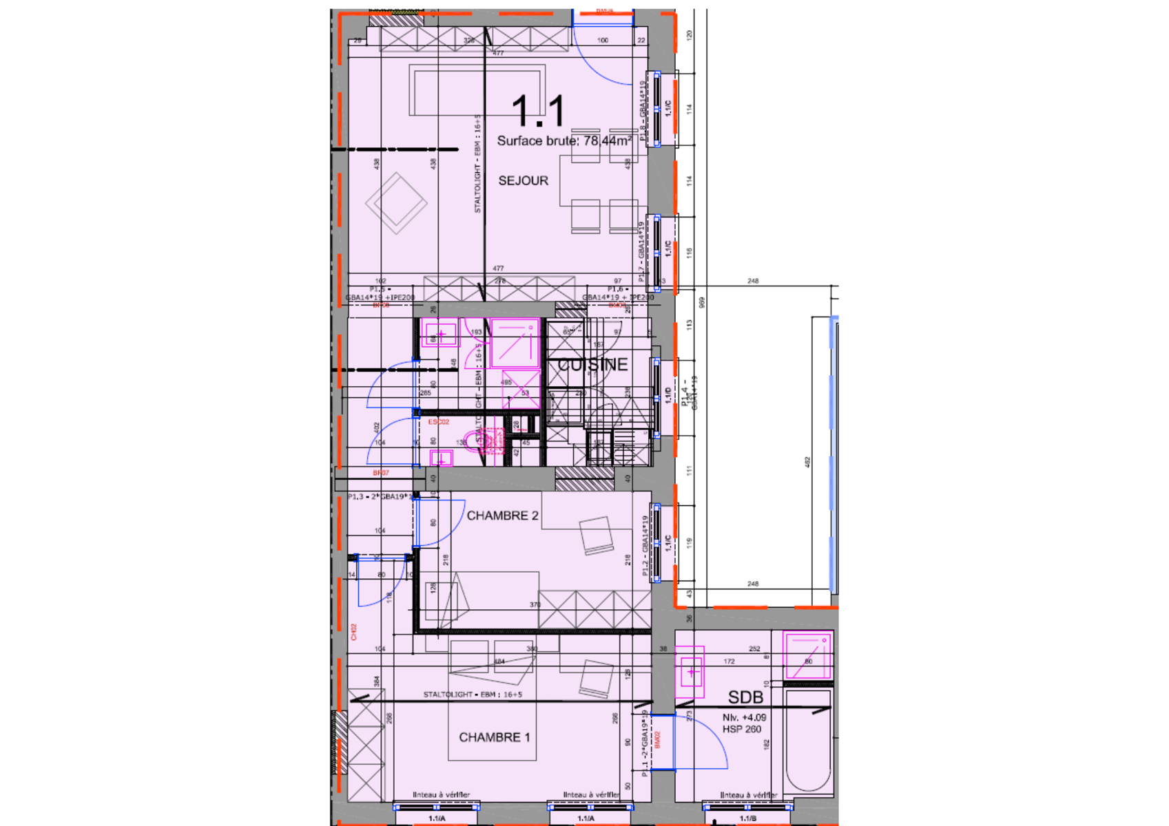 Appartement 1.1 – 1e étage – 78 m² : Séjour de 21m², une chambre de 8 m², une salle de douche, un WC séparé, une seconde salle de bain attenante (douche et baignoire) à la seconde chambre de 12 m².