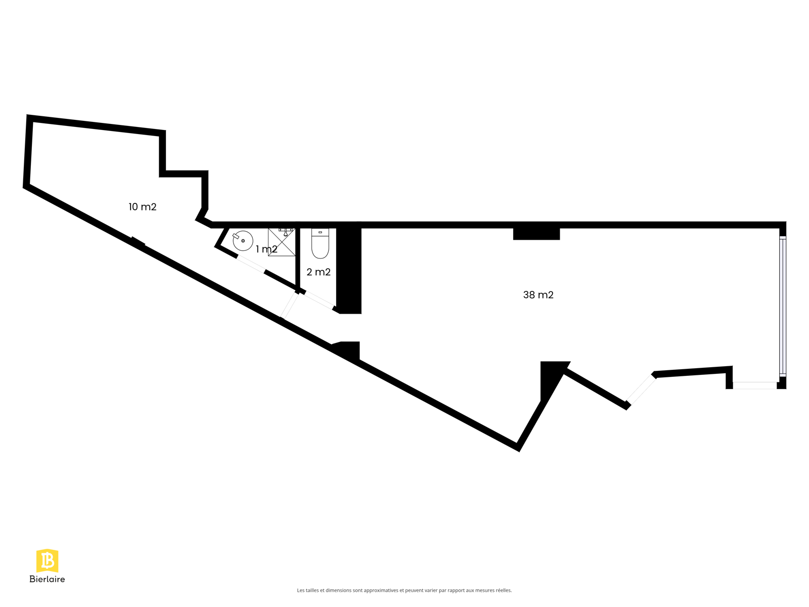 Un espace principal lumineux de 38 m² avec grande vitrine, offrant une excellente visibilité, une salle de douche, un WC séparé, une cuisine équipée.