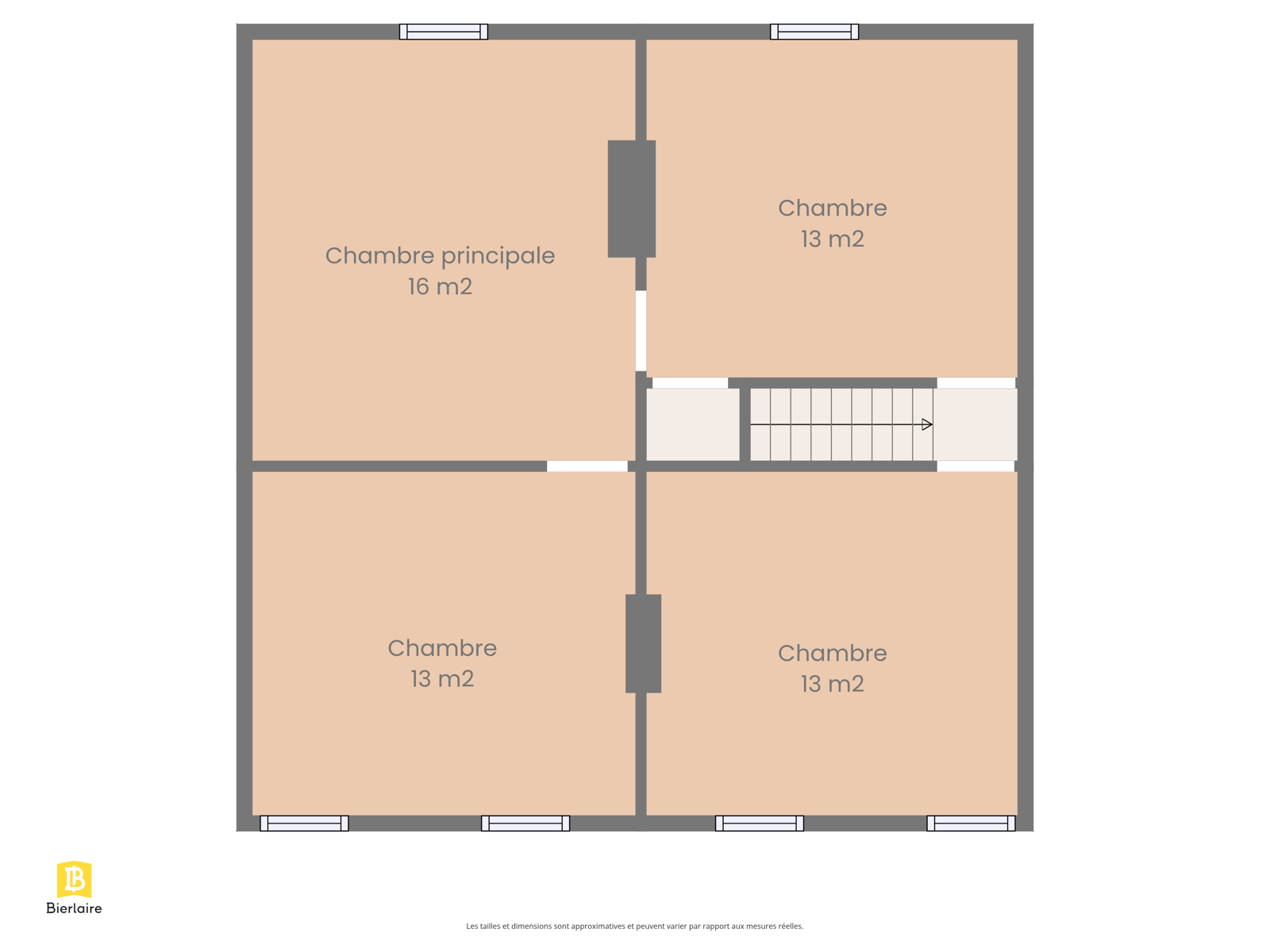 À l’étage, vous trouverez une première chambre ainsi que trois autres chambres en enfilade.