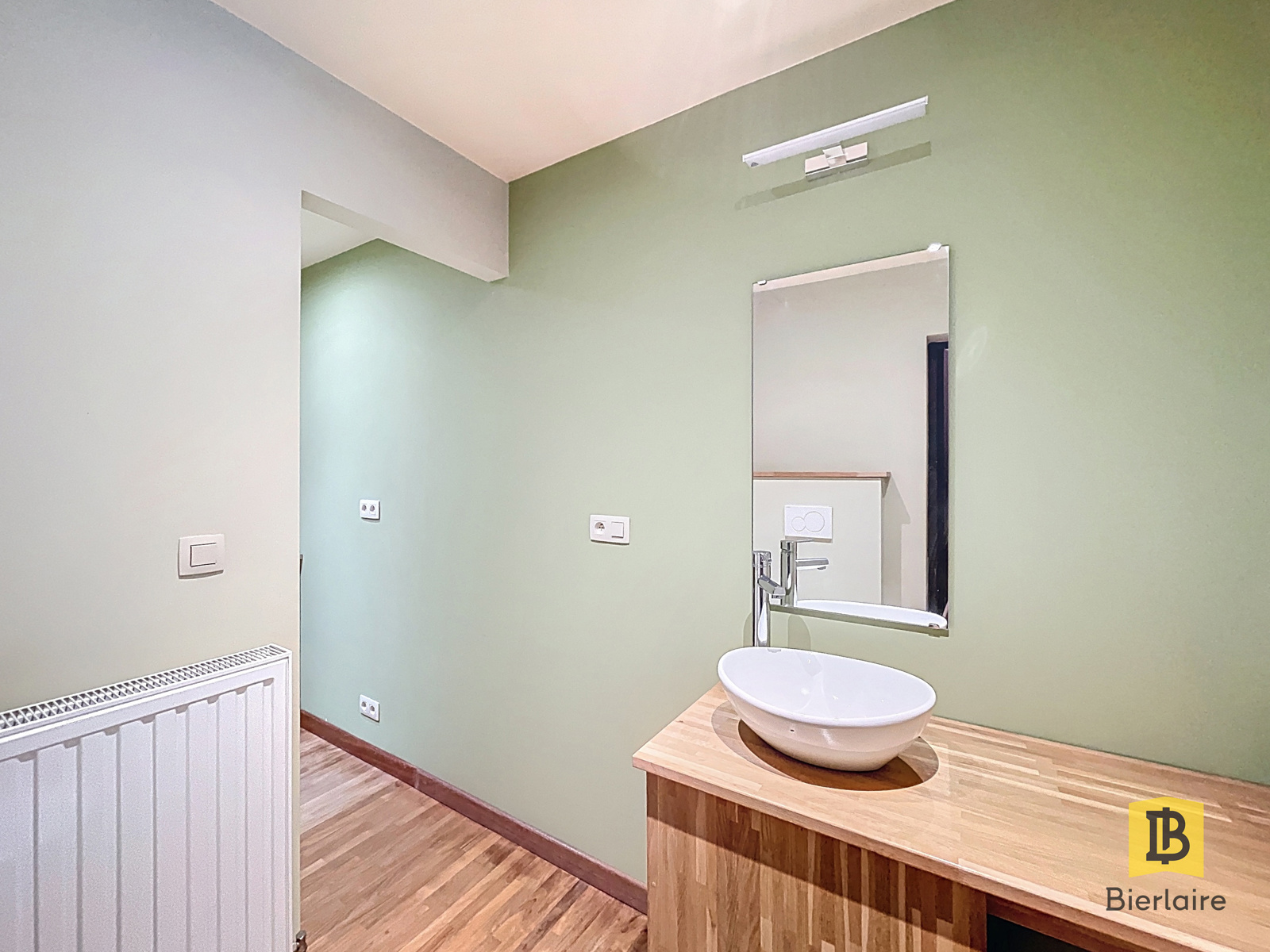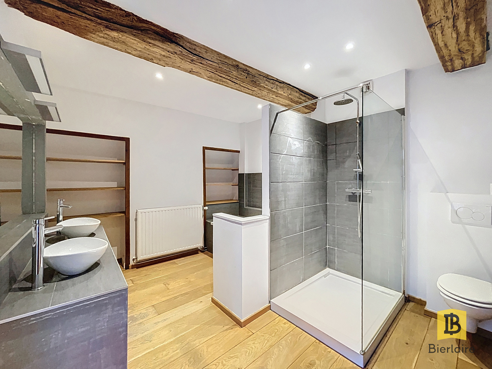 Au premier étage, vous trouverez une spacieuse salle de bain comprenant une baignoire, une douche, une double vasque et un WC, ainsi qu’une grande chambre de 22 m².