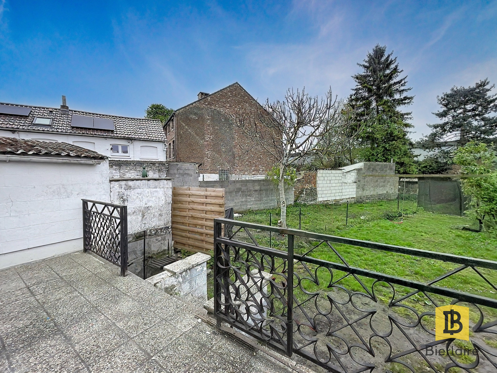 À l’extérieur, une terrasse et un jardin en contrebas.