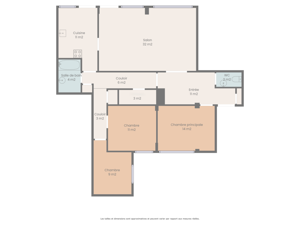 – Trois chambres de 9, 11 et 14m²