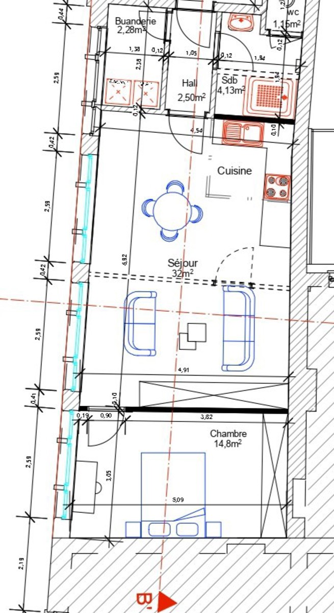– Vaste séjour de 32 m² avec cuisine intégrée, offrant un bel espace de vie convivial et lumineux