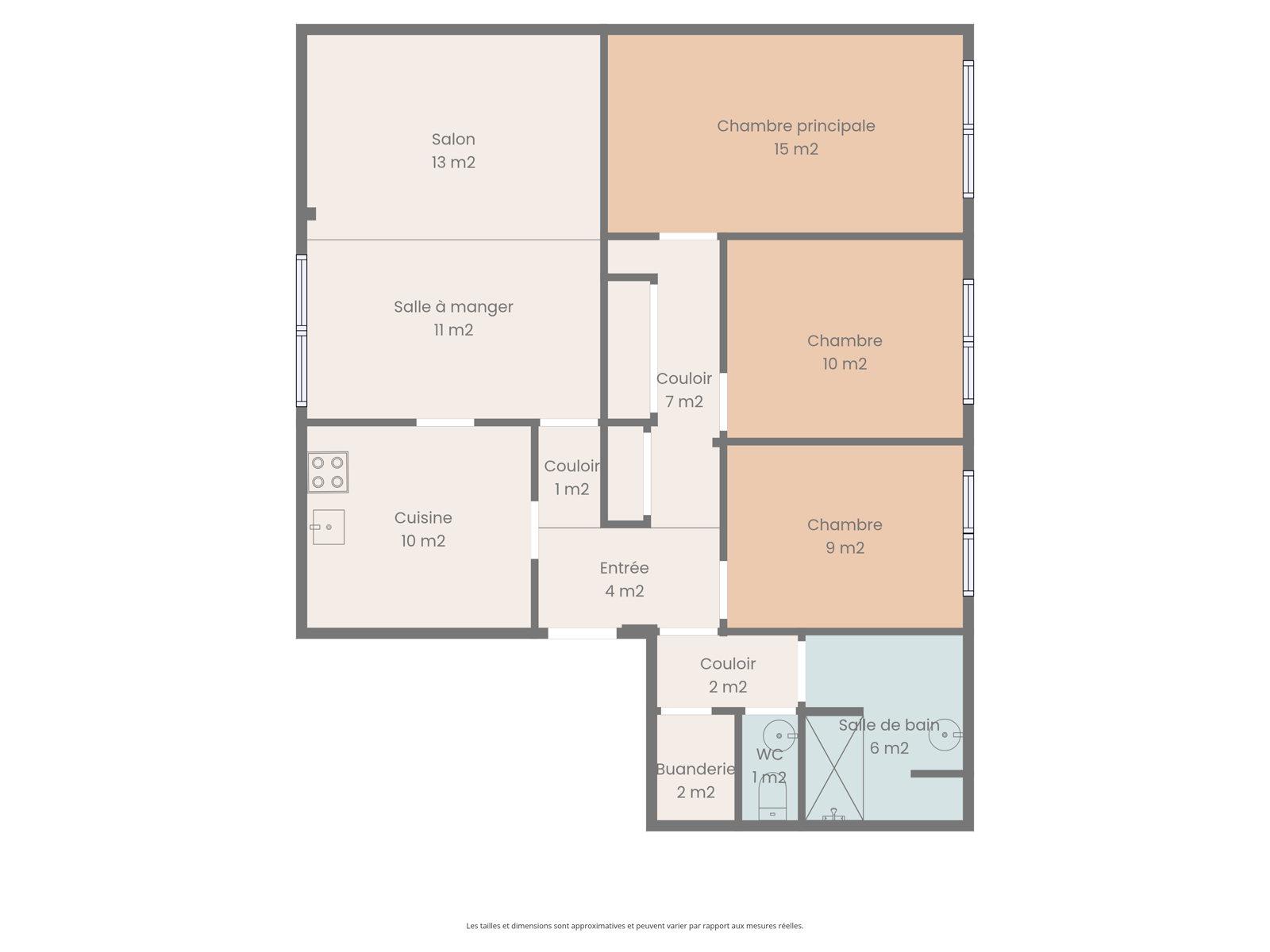 – Trois chambres : une suite parentale de 15 m² et deux chambres supplémentaires de 10 m² et 9 m²