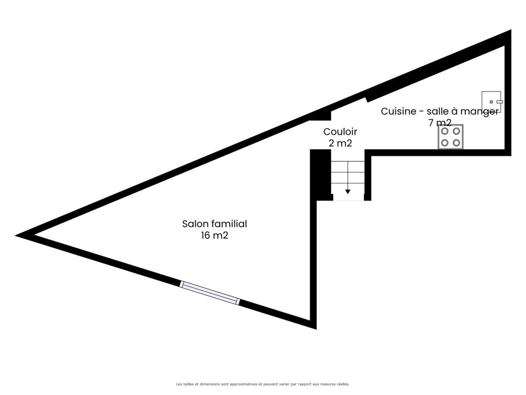 – Rez-de-chaussée : Hall commun, appartement comprenant un séjour, une cuisine, un WC séparé, une chambre et une salle de bain.