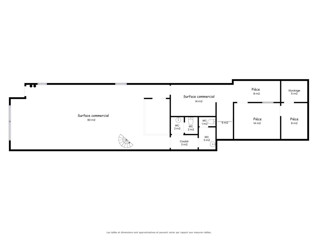 Rez-de-chaussée (83 m²) : vaste espace commercial lumineux, plusieurs pièces fonctionnelles et deux WC séparés.