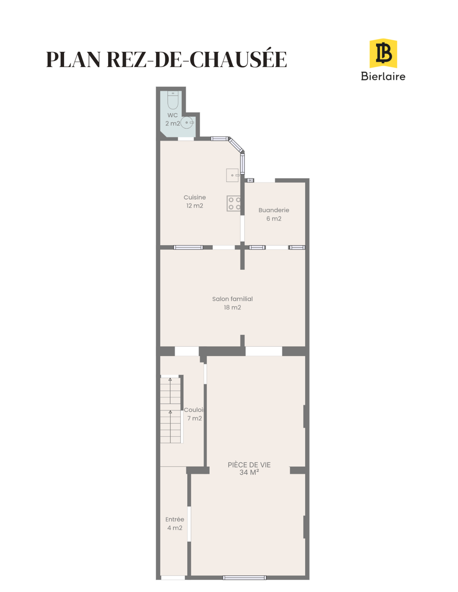 Au rez-de-chaussée : entrée de 4 m², couloir de 7 m², belle pièce de vie de 34 m², salon familial de 18 m², cuisine de 12 m², buanderie de 6 m² et WC de 2 m².