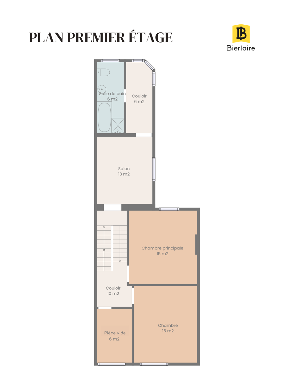 Au premier étage : salon de 13 m², deux couloirs (6 m² et 10 m²), salle de bain de 6 m², deux chambres de 15 m² chacune et une pièce de 6 m² modulable.