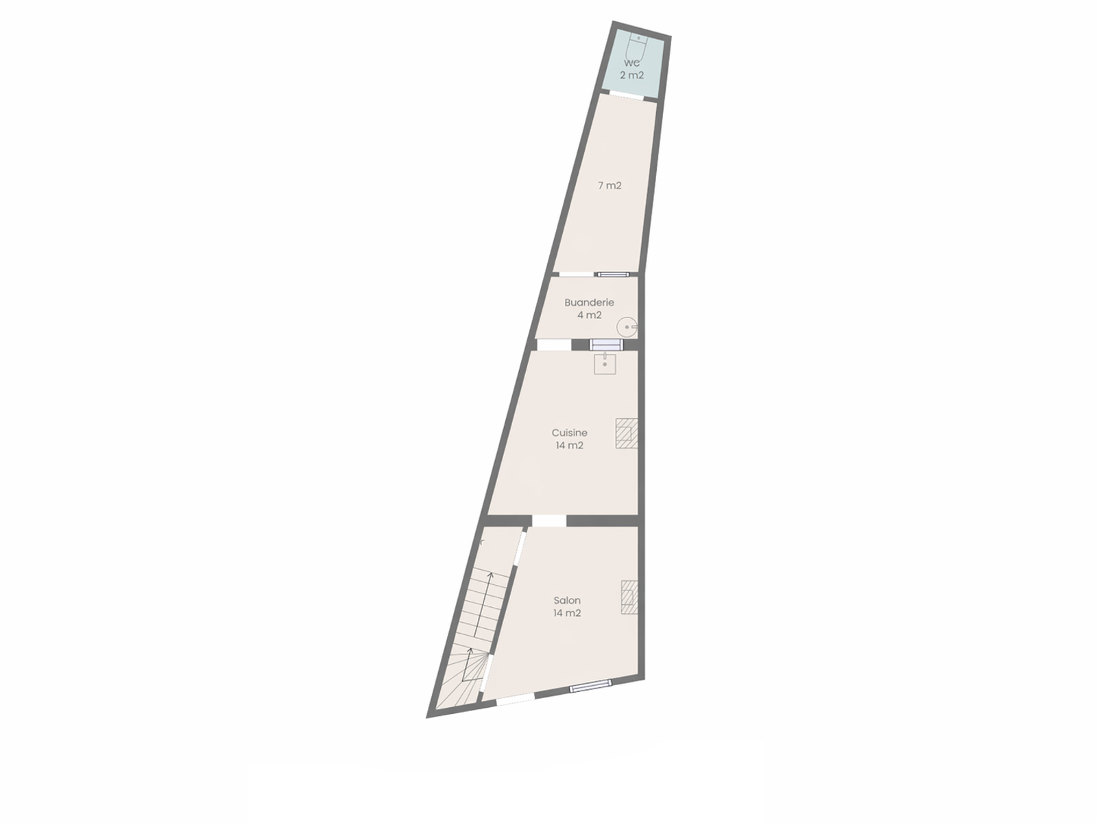 Le rez-de-chaussée comprend un séjour avec salon de 14 m², une cuisine de 14 m², une buanderie de 4 m², un espace complémentaire de 7 m² ainsi qu’un WC séparé de 2 m². Une petite cour extérieure complète ce niveau.