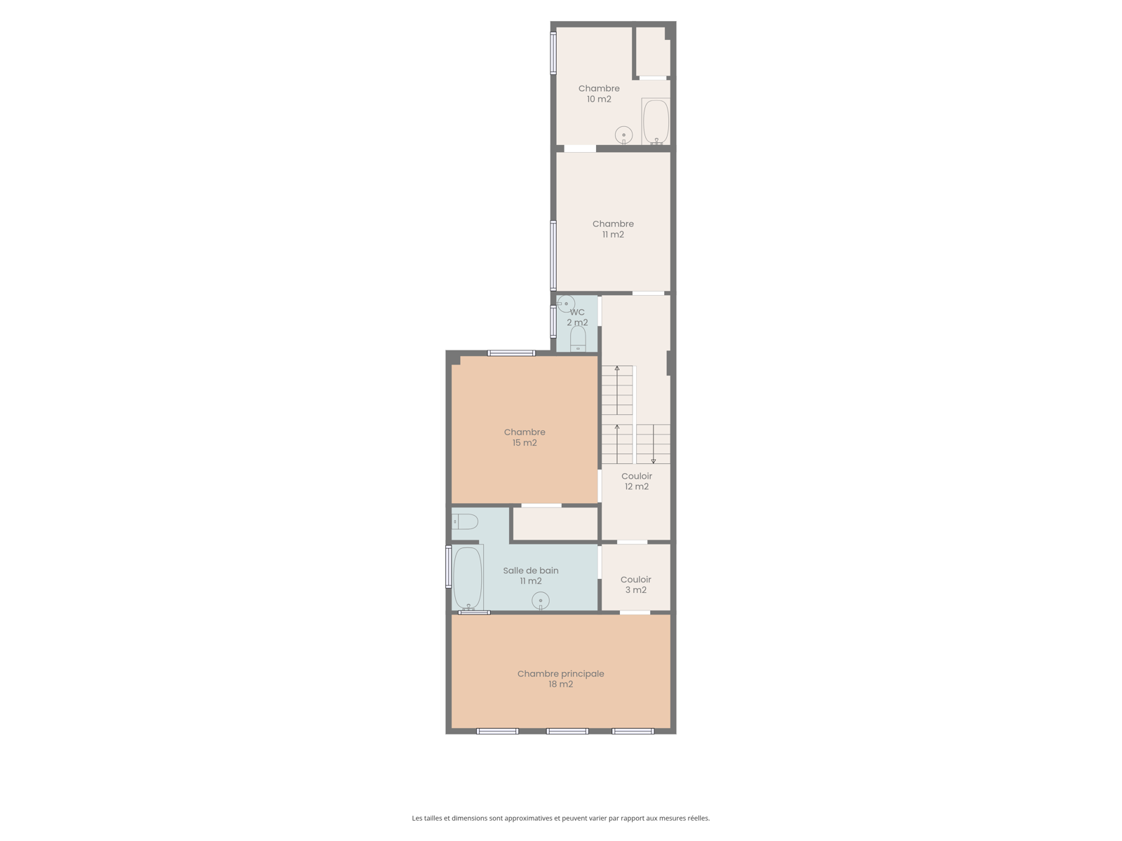 - Chambre principale de 18 m², très lumineuse grâce à de grandes fenêtres, avec salle de bain privative (baignoire)