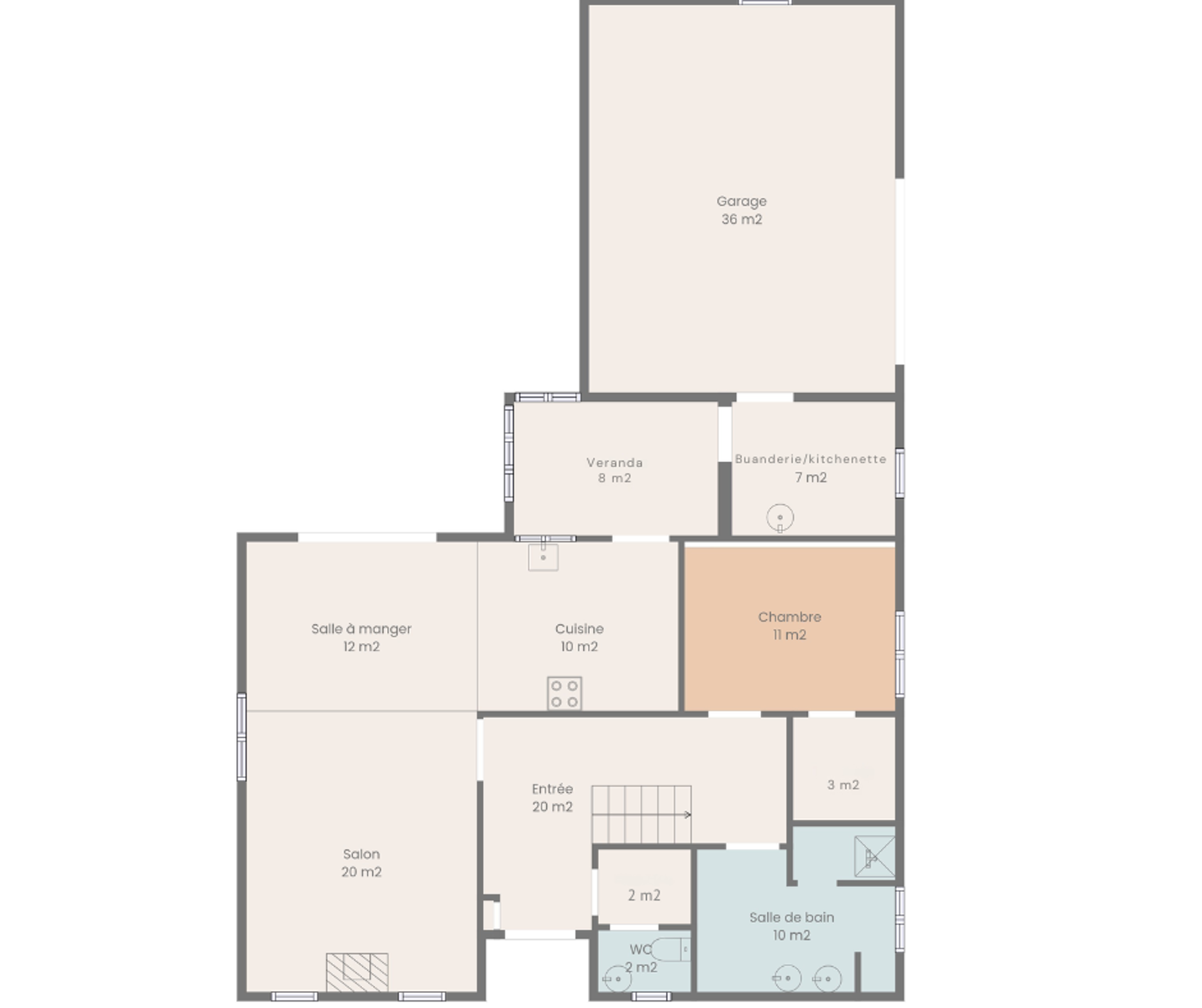 Le rez-de-chaussée se compose d’un hall d’entrée de 20 m², d’un salon de 20 m² et d’une salle à manger de 12 m² ouvrant sur une terrasse de 18 m² grâce à une baie vitrée, parfaite pour les repas en extérieur. La cuisine de 10 m² dispose d’un coin kitchenette/buanderie, prolongé par une agréable véranda donnant sur le jardin de 734 m². Vous trouverez également un WC individuel, une chambre de 11 m² et une salle de douche de 10 m² avec double vasque. Le garage fermé de 36 m² complète ce niveau.