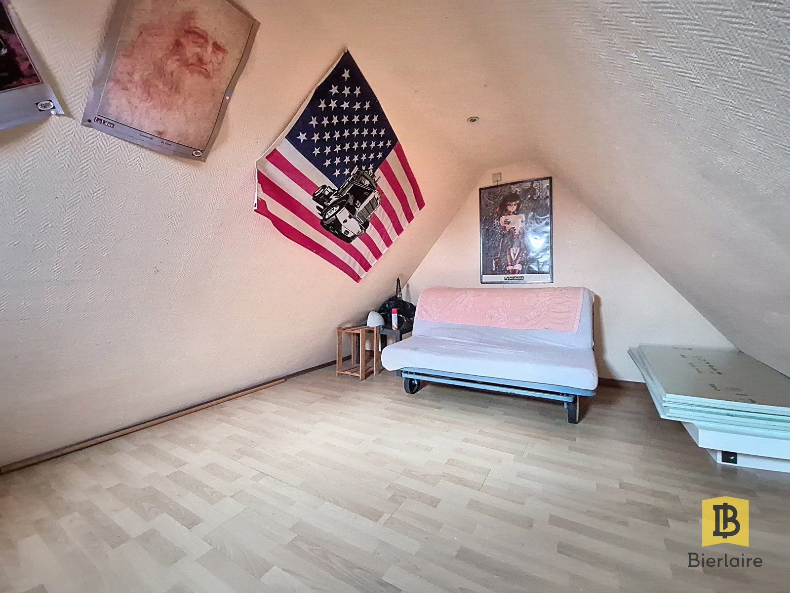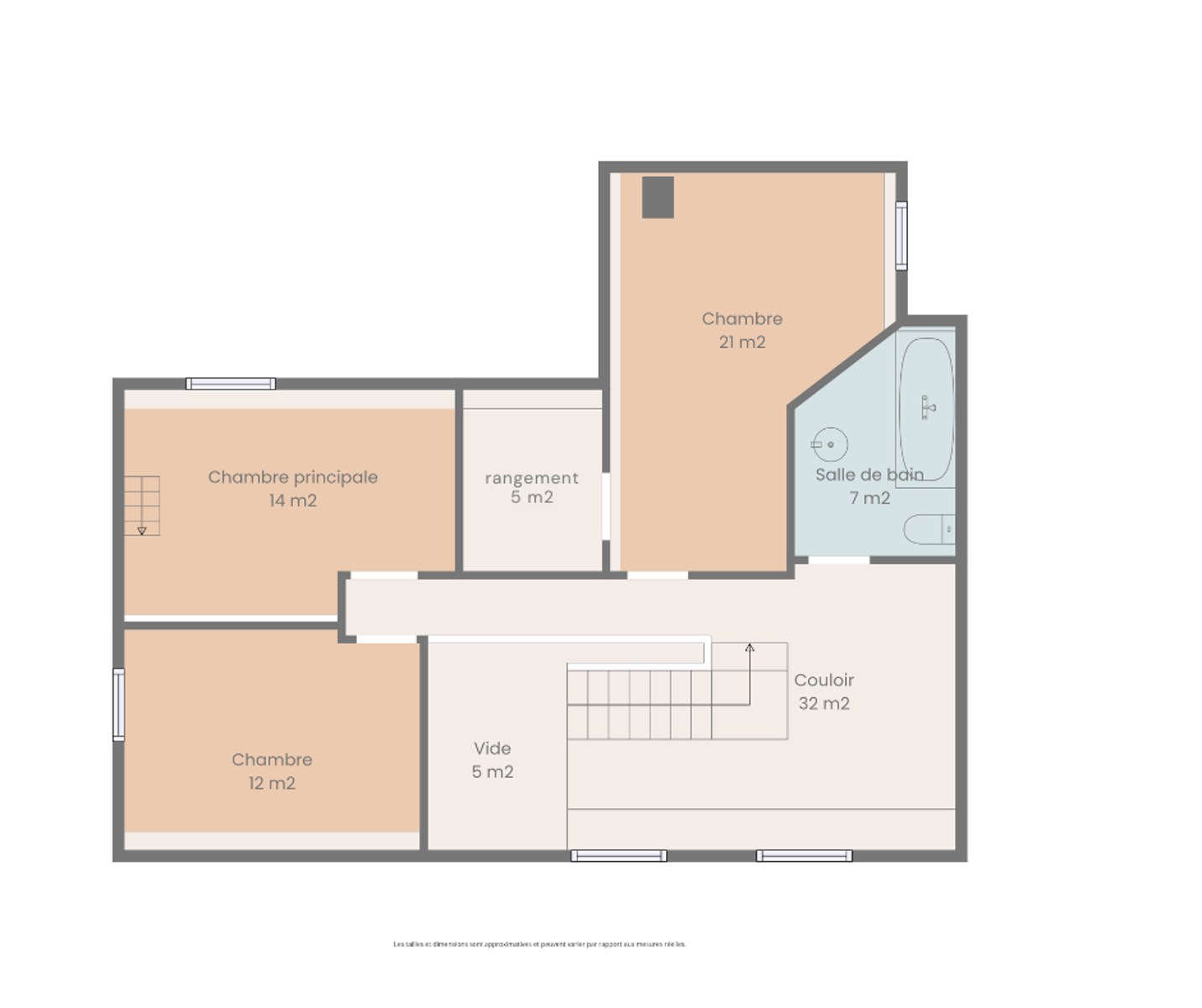 À l’étage, 3 chambres spacieuses : 12 m², 21 m² avec coin dressing de 5 m² et 14 m² avec espace supplémentaire de 10 m² accessible par un escalier de meunier, idéal pour salle de jeu, dressing ou coin télévision. Une salle de bain avec WC complète l’étage.
