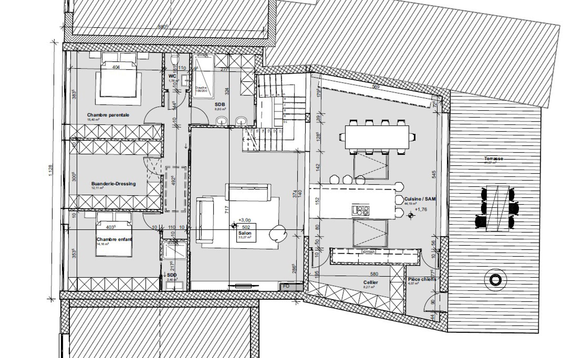 La maison projetée développe une surface habitable totale d’environ 290 m², offrant de très beaux volumes et un potentiel remarquable.