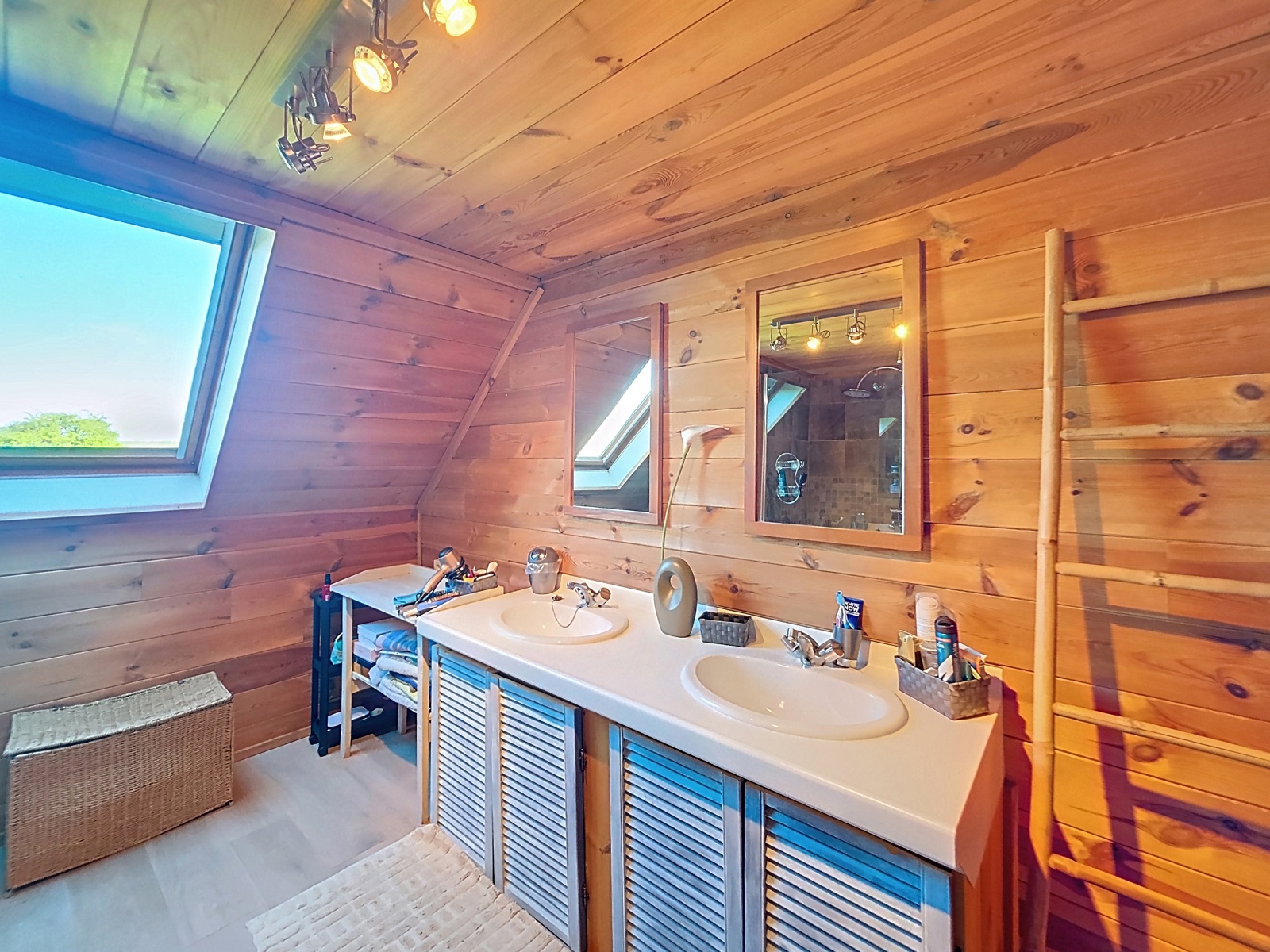 A l’étage : Un palier dessert une suite parentale avec bureau ou dressing, chambre et salle de douche. Un hall de nuit distribue les trois autres chambres, une deuxième salle de douche et un WC séparé.